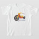 Tricycle à grande roue rouge et jaune avec crâne sur le repose-dos avec la légende "Je fais mes propres cascades."