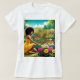 Une scène vibrante d'une femme afro-américaine dans une robe de soleil jaune vif plantant des fleurs dans un jardin luxuriant. Entourée de marguerites et de tulipes colorées, elle s'agenouille à côté d'un lit de fleurs sous un ciel bleu clair, capturant l'essence paisible d'une journée ensoleillée passée à jardiner.