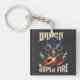 The design features a highly detailed, menacing dragon head with horns and glowing orange eyes. Flames and smoke are bursting from its mouth, emphasizing the "SUPER FIRE" tagline below. The overall aesthetic is dark, aggressive, and perfectly suited for heavy metal, fantasy gaming (like D&D), or gothic/streetwear fans who appreciate high-quality creature illustration. The bold typography of "DRAGON" above the creature completes the powerful composition.