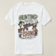Ce t-shirt blanc présente un design qui célèbre les activités extérieures. Le texte "CHASSE RÉSOLUE LA PLUPART DU PROBLÈME" est en haut, avec une illustration d'un fusil et d'un cerf. Ci-dessous, "FISHING SOLVES THE REST" est affiché au-dessus d'un poisson-basse bondissant, suggérant un amour à la fois pour la chasse et la pêche.