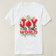 Ce t-shirt blanc présente un design de Noël vibrant. Le mot "JOY" est affiché en grandes lettres rouges, et le mot "O" est remplacé par un ornement de Noël rouge brillant. Au-dessus et au-dessous de "JOY", le texte "TO THE WORLD" est écrit en petites lettres vertes et rouges, entourées d'éléments festifs comme des flocons de neige, des sucres de canne, des mitaines et des branches de pin.