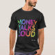 Un design de t-shirt audacieux avec l'expression "Money Talks Loud" dans un dégradé vibrant et multicolore. Les lettres ont une texture un peu désespérée pour un toucher usé et vintage.