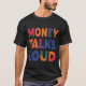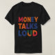 Un design de t-shirt coloré avec la déclaration audacieuse "Money Talks Loud" dans une police vibrante et multicolore.