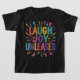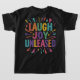 Un grand et audacieux slogan "Laugh Joy Unleashed" dans une police amusante et colorée. Un personnage de dessin animé ou une figure de super-héros qui rit hystériquement. Couleurs et graphiques brillants et ludiques.
