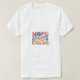 Le design du t-shirt comporte l'expression "Hope Sparks Revolutions" dans une police de caractères audacieuse, de style graffiti. Les lettres sont éclaboussées de couleurs vives et contrastées, créant un effet dynamique et énergique. La conception d'ensemble transmet un message d'optimisme et de changement social.