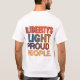 "Liberty's Light Froud People" est un design de t-shirt audacieux et graphique, mêlant néon et couleurs pastel. Le texte est agencé dans une disposition dynamique et asymétrique, créant un sentiment d'énergie et de mouvement.