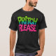 Ce design de t-shirt comporte l'expression ludique "PRITCH S'IL VOUS PLAÎT" dans une police audacieuse et colorée. Le texte est divisé en deux couleurs (vert pour "PRITCH" et rose pour "S'IL VOUS PLAÎT"), créant un contraste éclatant par rapport au tissu noir. L'esthétique générale est décontractée et humoristique, ce qui en fait une déclaration amusante.