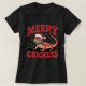A red bearded dragon wearing a Santa hat poses with holly and stars, surrounded by the festive pun "Merry Crickets" in bold red letters.