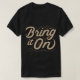 Un design de t-shirt audacieux et dynamique avec l'expression "Bring It On!" dans une mise en page dynamique et multicolore. Cette conception véhicule un sentiment de confiance, d'énergie et de disponibilité à relever les défis. Parfait pour ceux qui adoptent une attitude positive et affirmée.