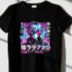 Voici un design de t-shirt inspiré de mangas et d'anime, avec un personnage de type cypunk, avec des yeux de néon brillants, des effets de pépin et un texte japonais lisant "Neo Tokyo" 🎮 🌆 ✨