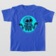 Bright blue neon skeleton in a glowing circle with a bold, playful vibe; high-contrast lines suit edgy streetwear and novelty tees.