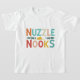 Ce t-shirt est tout à fait confortable, avec le texte "Nooks Nuzzle" affiché dans une palette multicolore. La police ludique laisse entrevoir la joie de se câliner dans un endroit préféré, tandis que les multiples couleurs évoquent un sentiment de chaleur et de détente. Imaginez-vous en train de glisser dans une couverture souple, le "coin de nuzzle" parfait, et de laisser fondre vos inquiétudes.