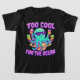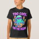 Un amusant poulpe bleu turquoise et violet pastel portant des lunettes de soleil flotte sur un flotteur de piscine en forme de Saturne, tenant des glaces colorées dans chaque bras - fraise, mangue et pistache. Placez-vous contre un océan bleu à l'aquarelle avec des reflets néons, des vagues douces et des reflets solaires. Le slogan audacieux "Trop Cool pour l'océan" ajoute un charme ludique, parfait pour les amateurs d'été et de plage.