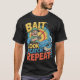 Ce t-shirt noir présente un dessin animé coloré d'un pêcheur plongé dans un poisson. Les mots "BAIT", "HOOK", "CATCH" et "REPEAT" sont empilés verticalement dans une police ludique, entourés de vagues et d'un coucher de soleil de style rétro. Parfait pour les amateurs de pêche.