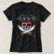 Un crâne menaçant, orné d'un casquette pirate classique et d'une lunette, est placé au centre de l'image. Les sockets oculaires vides du crâne se fixent avec une intensité sinistre, tandis que ses dents sont barrées dans un sourire froid. Deux couteaux croisés, ou épées de pirates, flanquent le crâne, ajoutant au sentiment général de danger et d'agression. Le design est rendu dans un style audacieux et graphique avec des contrastes noirs et blancs.
