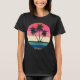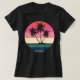 Ce design de plage présente la silhouette des palmiers contre un coucher de soleil rétro lumineux et le texte, "Zuma Beach, Californie."
