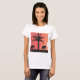 Ce T-shirt blanc est conçu avec ma représentation de deux éléphants et d'un palmier en silhouette par un ciel de coucher de soleil orange.