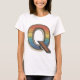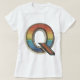 Ce t-shirt accrocheur présente la lettre "Q" ornée d'un vif dégradé arc-en-ciel. La lettre "Q" est présentée dans un style vintage avec une bordure noire, et son corps est rempli de bandes horizontales passant par un spectre de couleurs allant du rouge, orange, jaune, vert, bleu, au violet. La partie interne de la lettre a un motif de point détaillé qui ajoute de la texture et de la profondeur à la conception. Ce design allie une esthétique rétro à une touche moderne, ce qui en fait un ajout unique et élégant à toute armoire.