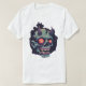 A high-contrast, stylized illustration of a horned, skull-like creature. The design features a cool-toned teal and purple color palette punctuated by glowing red eyes. Swirling dark smoke surrounds the head, which is detailed with cracked horns and sharp teeth. The artwork uses bold line work and vibrant highlights, reminiscent of modern sticker art, vintage comic books, or urban streetwear graphics.