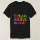 Le design du t-shirt comporte le texte "Dream. Crois. Atteindre..." dans un dégradé de couleurs vives, avec des formes abstraites et des motifs qui l'entourent. Le design est audacieux et attrayant, les couleurs sont vives et gaies. Le texte est écrit en caractères gras, et les mots sont espacés uniformément. Le design est centré sur la poitrine du t-shirt, et il est entouré d'une bordure blanche. Le design est simple mais efficace, et il est sûr d'attirer l'oeil de quiconque le voit.