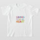 Le texte repose proprement sur le devant de la chemise, peut-être dans une couleur vive et amicale.Le texte se tient seul, peut-être dans une police ludique avec un seul coeur placé stratégiquement près des motsLe ton global peut être chaleureux, ludique, ou cool selon la police, les couleurs et le style d'illustration choisis