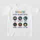 Playful space themed artwork made for curious kids and young students. Cute symbols like UFO, planet, moon, stars, rocket and alien help children explore space science and basic astronomy in a fun and friendly way.
