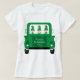 Un trio de mignons gnomes irlandais avec des fers à cheval chanceux et des shamrocks en camion vert de style vintage avec l'accueil "Happy St. Patrick's Day".