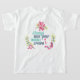 un T-shirt blanc avec un message inspirant et stimulant : "Portez toujours votre couronne invisible", écrit dans une police élégante et colorée. Le design est agrémenté d'éléments floraux vibrants, dont des fleurs roses, des feuilles verts et des tourbillons décoratifs, ainsi que d'un petit symbole de couronne. L'expression encourage la confiance en soi et la force intérieure, rappelant au porteur de se porter avec grâce et dignité, même lorsque personne d'autre ne la voit. C’est un vêtement gai et motivant qui célèbre la valeur personnelle et l’amour de soi.