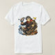 Anime-inspired adventurer with rugged gear perched among rocky terrain, bold earthy palette and playful birds, perfect for outdoor, travel, and streetwear apparel.