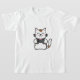 un mignon chat blanc au nez rose, portant un t-shirt noir et tenant un contrôleur de jeu, avec une expression joyeuse sur le visage.