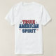 Le design des t-shirts comporte l'expression "True American Spirit" en caractères gras et graphiques avec un schéma coloré multicolore. Les couleurs utilisées sont le rouge, le blanc et le bleu, qui sont les couleurs du drapeau américain. Le design est simple et attrayant, et il est sûr de faire une déclaration.