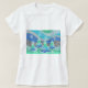 Un paysage hivernal moderne et stylisé avec des pins gelés et des flocons de neige étincelants. T-shirt avec un design personnalisable vert, bleu, gris argenté et blanc pour vous permettre de personnaliser avec votre propre texte, images et idées. Image créée à l'aide d'un dessin au crayon de couleur numériquement amélioré.