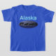 Une nuit d'hiver au clair de lune ; un pack de loups à la chasse. Le texte "Alaska" en bleu et blanc brillant apparaît également.