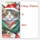 This charming design features a delightful watercolor illustration of an adorable tabby with captivating green eyes, wearing a festive Santa hat nestled beside beautiful Christmas decor.