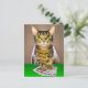 Postcard in a portrait of a brown and tan tabby cat playing cards - and winning