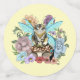 A cute tabby cat with blue fairy wings is sitting on a mushroom with a variety of colourful flowers all around the fairy cat