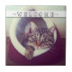 This ceramic tile features my close-up photograph of an adorable gray and brown tabby with his paw hanging out of his little hut that was run through a vintage effect. Fill in the template field with something you'd like to say to personalize or click the customize to select a different font style, size and color. In customize you can remove the white bar to have just the photograph.