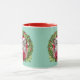 A cute funny Christmas coffee mug featuring a grey tabby wearing a Santa hat looking out from a Christmas wreath.