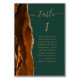 Le bord gauche de cette élégante carte de numéro de table mariage moderne comporte une bordure d'aquarelle couleur orange brûlée et rouille, ornée d'une parties scintillant en faux or. Le mot "table" apparaît dans un script d'écriture manuscrite de couleur or sur un arrière - plan vert foncé. Ajoutez les noms de vos invités qui sont affectés à chaque table.
