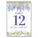 Créez facilement vos propres cartes de numéro de table avec ce modèle floral aquarelle. Vous pouvez facilement changer le numéro de table et vos noms. Vous pouvez également changer la police et la couleur du texte et la couleur arrière - plan Il présente de belles fleurs de glycine qui descendent d'une vigne de glycine.