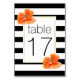 D'élégantes rayures noires et blanches et des pavots de corail ornent cette carte de numéro de table mariage. Choisissez-le pour votre table mariage de printemps ou d'été !