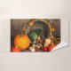 Serviette sertie d'une photo d'une récolte d'action de grâce, posée sur une table en bois rustique. Citrouille, pommes de terre, courge etc... composent cette belle collection de nourriture. Des feuilles d'automne colorées entourent le panier de la cornucopie.
