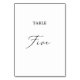 Ce délicat tableau de calligraphie noire cinq numéro de table est parfait pour un mariage moderne. Le design minimaliste romantique présente une belle et élégante typographie noire sur un arrière - plan blanc au look épuré et sobre. La carte s'imprime à l'avant et à l'arrière (double face). Les autres numéros de tableau de la collection sont vendus séparément.