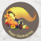 Belle corne d'abondance avec citrouille, fruits et feuilles d'automne sur le beige clair et marron Table Confetti.