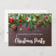 Carte d'invitation de Noël avec une photographie rustique d'une table en bois marron avec des pommes de pin, des aiguilles de pin, de la neige et des décorations de Noël. Festive et charmante.