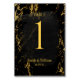 Un élégant marbre noir avec des veines d'or et des lettres d'or carte numéro de table mariage qui peut être customisé avec n'importe quel numéro de table. Les graphiques apparaissent des deux côtés de cette carte.