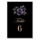 Numéro de table mariage noir avec un motif floral violet et gris élégant.