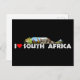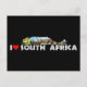 Part of our South African Landmarks collection, we have taken Table Mountain and it made it wild, With photos of various African wildlife in the shape of Table Mountain on this postcard. This one has the phrase I Heart South Africa in white text.
