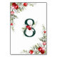 Ce Noel Table Number présente 8 baies sauvages décorées et feuillage d'arbustes aux couleurs traditionnelles de Noël et décoré d'un cadre de feuillage forestier et de baies rouges juteuses avec arrière - plan blanc. Profite-en.