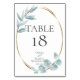 Wedding Table Number Card | Watercolor eucalyptus leaves in tones of dusty blue with a gold oval frame. Customize text, font style, colour and size. Original artwork created for the BarefootBride™ by © WhimsicalArtwork™ - This is part of a complete Wedding Stationery Suite with matching wedding, baby shower and other event stationery.